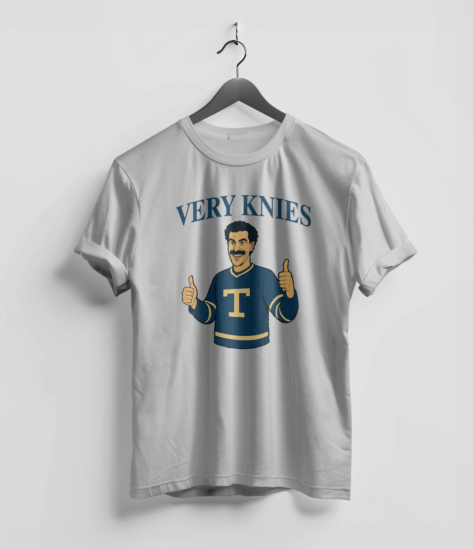 Perfect for Leafs fans, hockey fans, and anyone who loves a clever mashup, this shirt brings together two icons: Borat’s legendary catchphrase and Knies’ rising-star status on the ice. It’s funny, bold, and instantly recognizable.